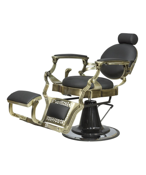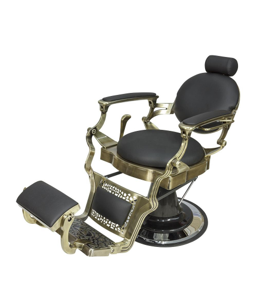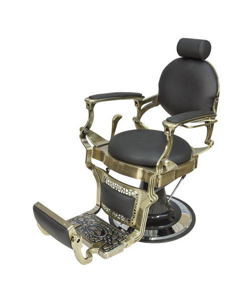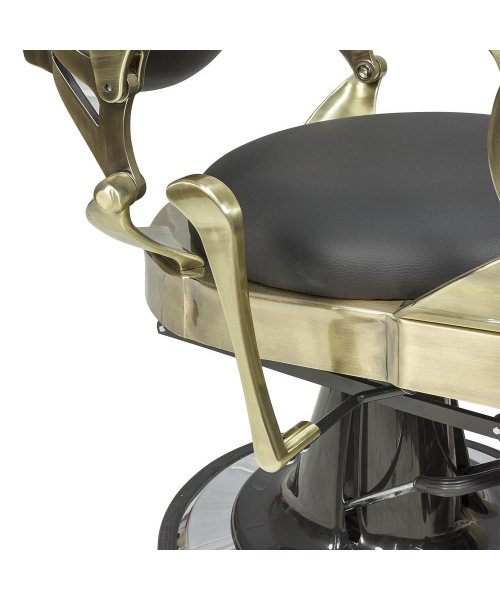 Кресло мужское барбер "Ричард" полированный каркас медного цвета - удобное сидение оснащено широкими подлокотниками для комфорта посетителей. Для поддержания шеи и головы клиента в конструкции предусмотрен мягкий подголовник. Практичная подножка не допустит усталости ног клиентов. Металлическая круглая основа с хромированным покрытием отличается прочностью и устойчивостью. Каркас изготовлен из качественной стали и многослойной фанеры. В качестве наполнителя использован эластичный поролон. Обивка выполнена из экокожи.  Материал легко очищается от загрязнений, не боится влияния дезинфицирующих и моющих средств. Благодаря своей структуре экокожа не протирается и долго сохраняет красивый внешний вид. В дизайне кресла присутствует много металлических  деталей и фурнитуры под медь или шагрень. Подлокотники и подставка на подножках обиты экокожей, что придает креслу большей солидности, а клиенту максимального комфорта. Гидравлический подъемник, используемый для подъема кресла, способен выдержать высокие нагрузки. Для регулировки угла наклона спинки и подножки используется надежный пневматический механизм. Подъем подголовника осуществляется с помощью механики.